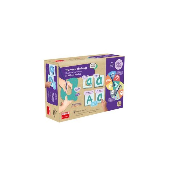 Juego EL Reto de las Vocales Texturadas. Set contiene 20 cartas de las vocales con distintas texturas y cortes medidas 8.9 x 8,9 cm. 2 discos para ruleta de 12 cm. de diametro, 5 vocales perforados de 12 x 13 cm. Todos fabricados en carton duro. Ademas de 5 cordones de colores y 2 flechas de plastico para la ruleta. Presentacion en caja de carton medidas 20 x 6,5 x 13 cm.