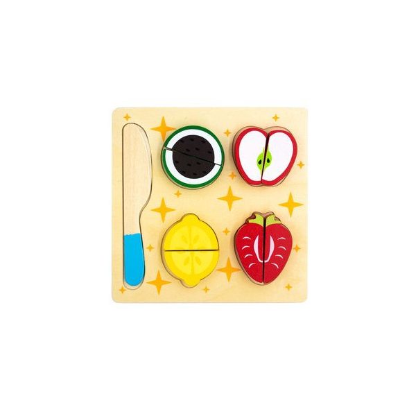 Maximize Encaje de madera natural pintada, compuesto por 1 tablero medidas 18 x 18 cm, 1 cuchillo medidas 15 x 2 cm y 8 frutas como manzana, frutilla, limon y kiwi, medidas entre 15 y 5 cm. Incentiva la vida sana, el desarrollo visomotriz, pensamiento logico, reconocimiento de distintas verduras y la imaginacion.