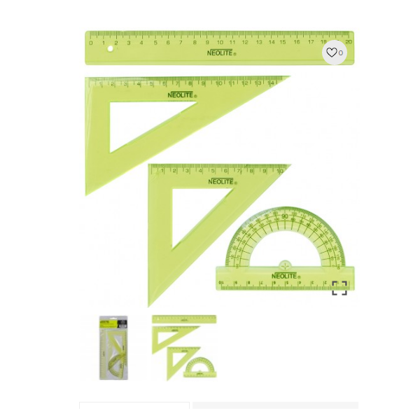 Maximize Set de geometría Neolite para el colegio, universidad o la oficina. 4 piezas: regla de 20 cm, transportador de 180° x 10 cm, escuadra de 45° x 15 cm y escuadra de 60° y 15 cm. En plástico translúcido que permite observar la superficie de medición. Biselada, de alta resistencia y flexibilidad. Incluye estuche de PVC.