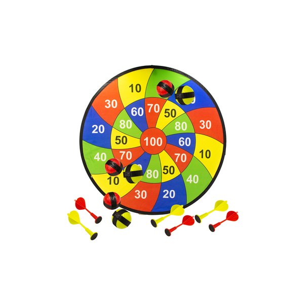 Juego de lanzamiento. Set contiene base plegable con blanco de lanzamiento fabricado en tela medidas 50 cm de diámetro. También contiene 6 cardos con velcro fabricados en plástico medidas 10 x 3 cm. 6 pelotas con velcro de 4 cm de diámetro. Presentación en caja de cartón medidas 42 x 25 x 5,5 cm.