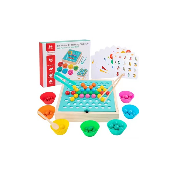 Maximize Juego de clasificación y memorice, set incluye una tabla de madera perforada, pinzas, cucharas, bolas de colores, tarjetas de actividades y cuencos de colores. Presentación en caja de cartón medidas 20 x 6,5 x 20 cm.
