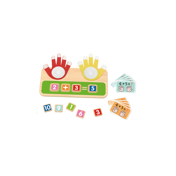 Maximize Juego de conteo y encaje los números. Contiene una base de madera, medidas 29,5 x 15 cm. con espacios para insertar bloques con números y símbolos matemáticos, En el tablero vienen 2 manos movibles de tela con velcro medida 14 x 12,5 cm. Incluye 8 fichas cuadradas de madera medidas 3,3 x 3,3 cm. con números del 0 al 10 y signos de operación (+ - =). Finalmente incorpora 10 tarjetas de doble cara con problemas de suma y resta, medidas 5,7 x 8,8 cm.. Presentación en caja de cartón medidas 31 x 15,5 x 3 cm.
