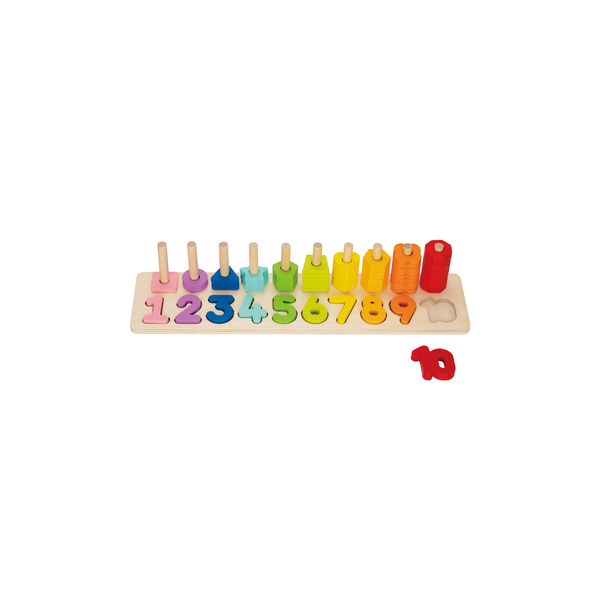 Maximize Ábaco de madera para encajar números y figuras geométricas. incluye figuras de madera, que en su interior contienen un pequeño agujero, cada una de estas tienen una medida de aproximadamente 4 cm. Además, trae una base de madera con tarugos medidas de 44,5 x 11 x 8 cm y los tarugos con medidas de 7 cm. Presentación en caja de cartón medidas 45,5 x 12 x 9 cm.