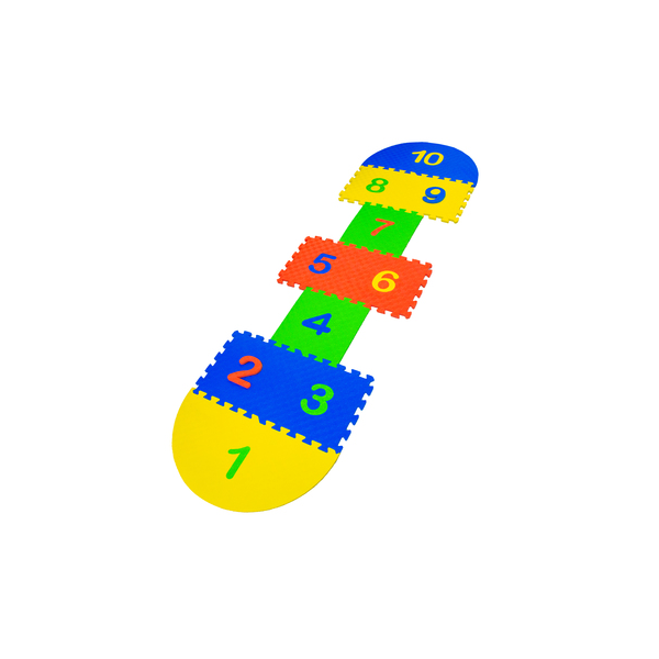 Maximize Alfombra didáctica tipo luche. Set de10 módulos encajables tipo rompecabezas. Fabricados en goma eva soft, con colores amarillo, rojo, verde y azul. Cada uno con números distintos. Los números 1 y 10 miden 59 x 1 x 30 cm. Desde el 2 al 9 miden 30,5 x 1 x 30,5 cm. Set también consta de 4 discos de goma eva en diferentes colores medidas 1 x 6,5 cm de diámetro. Presentación en bolsa de plástico transparente.
