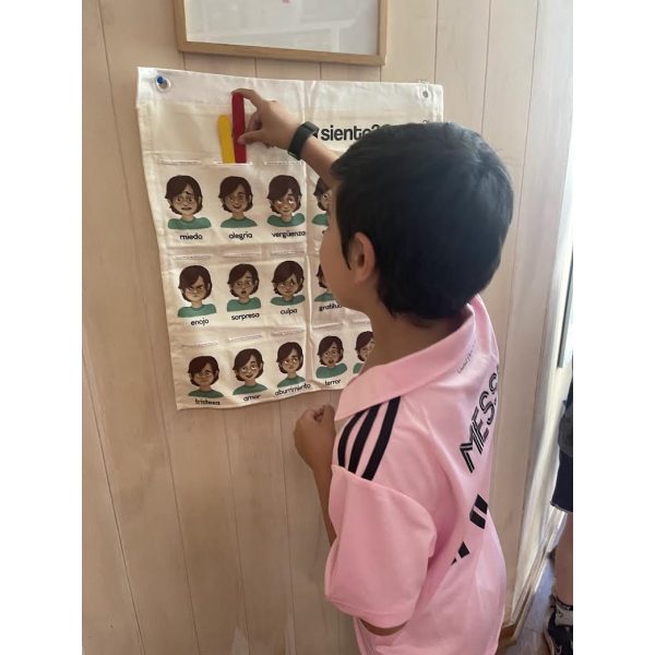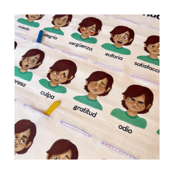 Este lienzo, fabricado en algodón lavable y planchable, cuenta con ojales para que puedas colgarlo en un lugar visible de tu hogar, aula o espacio de trabajo. El juego tiene como meta ampliar el vocabulario emocional a 18 emociones, cada una simbolizada por un personaje llamado Milo.