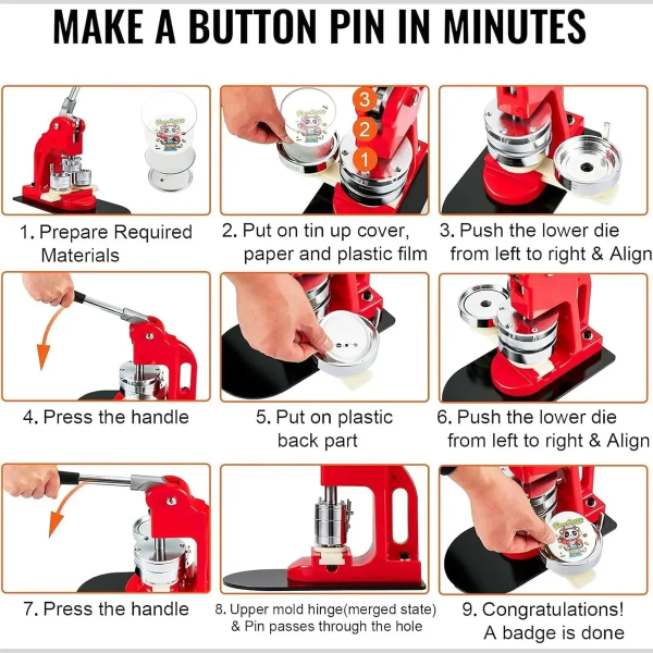 La máquina contiene un molde de 58 mm y 50 insignias. La máquina es un estante de acero, duradero y adecuado para la producción de grandes cantidades. Podrás crear un emprendimiento muy rentable para realizar todo tipo de chapitas promocionales desde 25 hasta 75 mm de diámetro, como prendedores, llaveros, magnetos, destapadores de botellas y espejos entre otros. Tiene matrices intercambiables (se venden por separado). Es muy fácil de usar, no requiere instalaciones especiales ni gran espacio de trabajo. 1. El fabricante de insignias es perfecto para crear su propia insignia. Con esta máquina amigable para el operador puedes hacer todo tipo de botones. 2. El diseño Das de parada positiva garantiza la alineación del troquel superior e inferior. El mango acolchado es fácil de usar y solo necesita poca fuerza a un botón para presionar, eliminando la máquina muy fácil de usar. 3. Utiliza nuestras piezas clave para tu propia insignia DIY. Con el logotipo de tu empresa o evento puedes hacer campañas de publicidad y promociones. 4. Inserte la parte posterior de plástico duro, para que no se pueda enchufar fácilmente la insignia. Especificaciones Mango suave y confortable al tacto, hecho de aleación de aluminio, que lo hace robusto pero liviano de usar e inoxidable. Mecanica de rodamiento fácil de presionar. Bandeja inferior de 10 mm de grosor para una mejor estabilidad. Medidas de la máquina: 11.81*18.5pulgadas. Peso neto: 4,2 kg Semi manual and semi mechanical