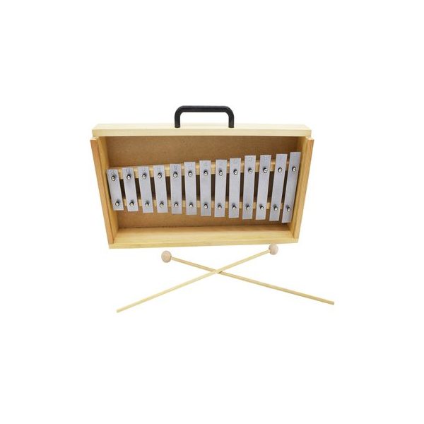 Metalofono 13 notas en caja de madera, teclas en aluminio, 2 baquetas de madera de 21 cm de largo.Tamano 38 x 18 x 5 cm. Desarrolla coordinacion y concentracion. Estimula la memoria, el analisis, la sintesis y el razonamiento. Presentacion caja de carton