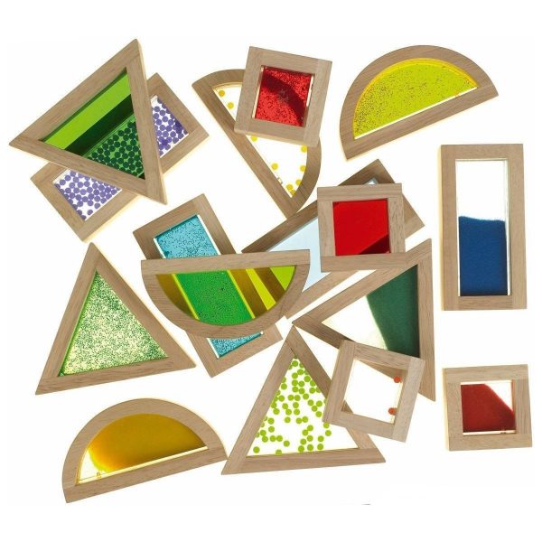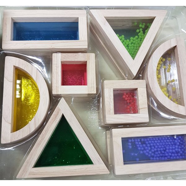 Bloques Sensoriales Arcoiris compuesto por 16 figuras geometricas de madera natural. Incluye 4 triangulos de 14 x 14 x 3,2 cm, 4 cuadrados de 7 x 7 x 3,2 cm, 4 rectangulos de 14 x 7 x 3,2 cm, y 4 medios circulos de 14 x 7 x 3,2 cm, todos con diferentes rellenos como: liquidos brillantes, polvo de color, pelotitas y mica transparente de color. Desarrolla percepcion visual y auditiva, motricidad, clasificacion creatividad e imaginacion.
