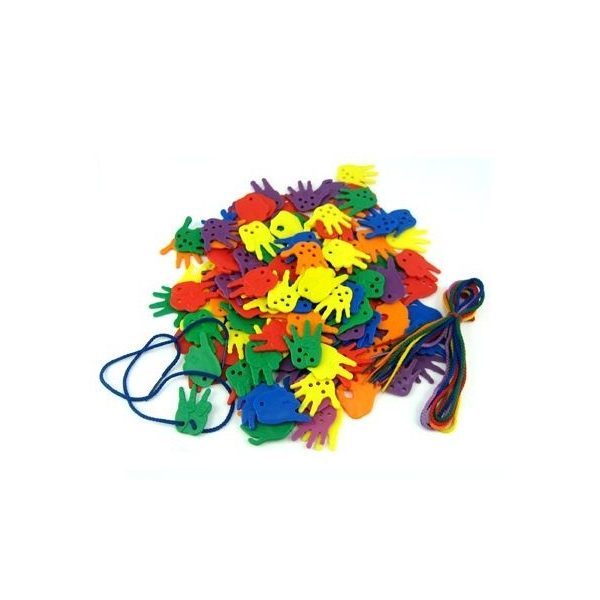 Set de 72 manitos contadoras, en material plastico resistente, de diferente colores. Juego muy completo en el que, ademas de ensartar y de motivar ejercicios de seriacion y clasificacion, tambien ayuda a comprender el concepto de lateralidad ya que incluye manos izquierdas y derechas. Estimula el aprendizaje y reconocimiento del numero y cantidad. Este set contiene 6 cordones. Medidas: 5 x 3 cm cada manito. Este mismo producto se encuentra disponible en el codigo: JUEGUSL099.