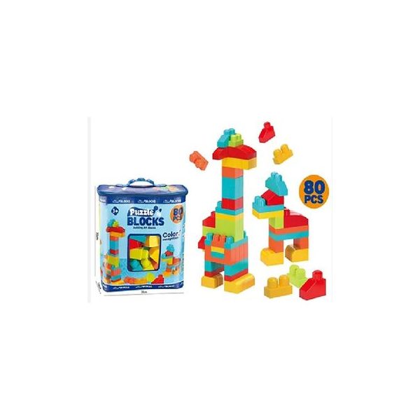 Bloques tipo lego, set contiene 80 piezas tipo lego, fabricados en plástico medidas entre 3 x 6 x 3 cm. y 3 x6 x 12,6 cm. Presentación en bolsa de tela plástica gruesa con cierre medidas 27 x 12 x 27 cm