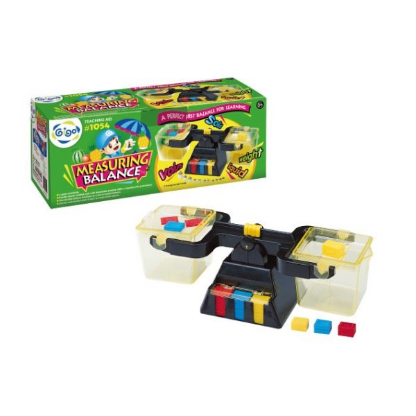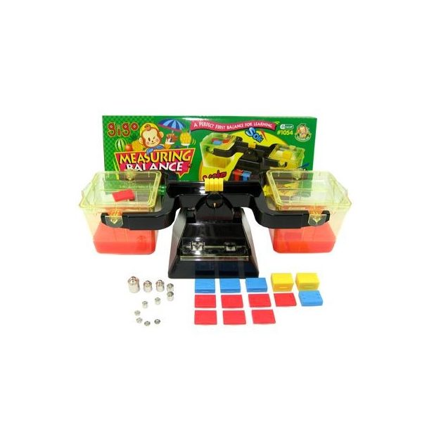 Balanza de plastico no toxico y resistente para experimentar con solidos y liquidos. Su objetivo es aprender nociones de peso y equivalencias. Cada juego incluye una balanza, 2 cubos transparentes con tapas, 14 pesos plasticos apilables y 11 pesos de metal (total: 246g). Tambien incorpora pesas plasticas y metalicas.