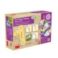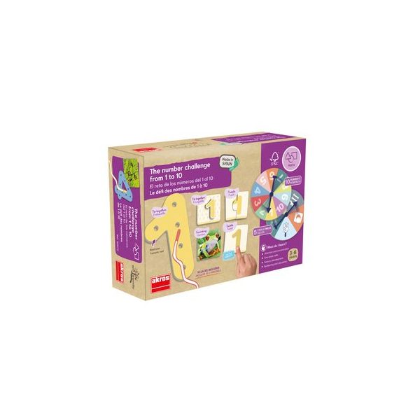 Juego El Reto de los Numeros del 1 al 10. Set contiene 20 cartas de numeros distintas texturas y cortes medidas 6,5 x 6,5 cm. por lado. 2 discos para ruleta de 12 cm. de diametro, 10 numeros perforados de 8 x 7 cm. Todos fabricados en carton duro. Ademas de 10 cordones de colores y 2 flechas de plastico para la ruleta. Presentacion en caja de carton medidas 20 x 6,5 x 13 cm.