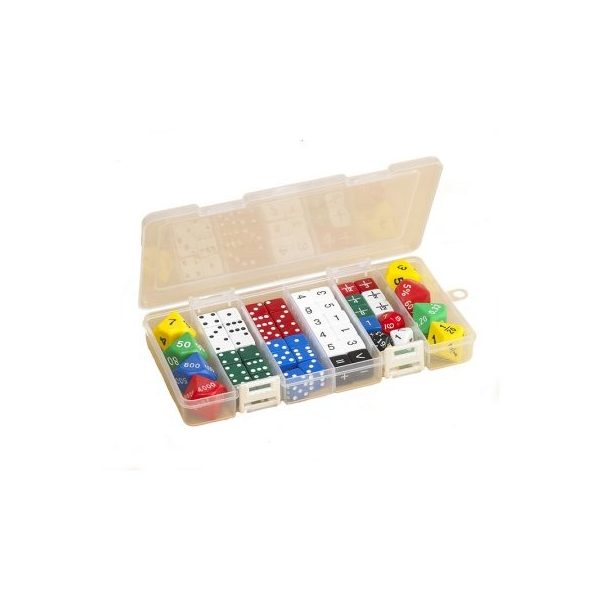 Set de 56 dados tamano jumbo con diversas formas, de colores amarillo, verde, azul, rojo, blanco y negro. Este material sirve para ensenar conceptos numericos, valor posicional, fracciones, equivalencia y operaciones, para el desarrollo de habilidades matematicas.