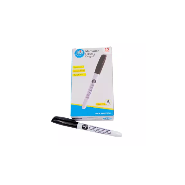 Marcador de pizarra delgado color Negro , punta redonda, de intenso color y secado rápido. Presentación en caja de cartón.