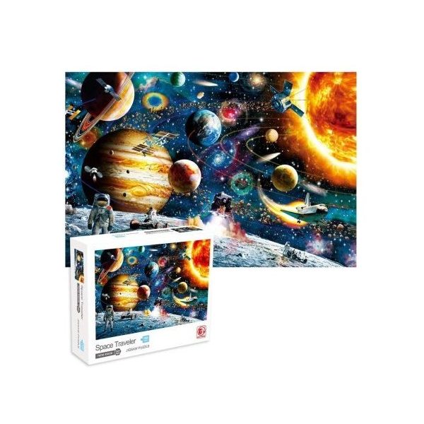 Puzzle de 1000 piezas motivo viaje al espacio, medidas 70 x 50 cm, material reciclable, grueso y resistente. Desarrolla la coordinacion visomotriz, habilidades motoras finas, resolucion de problemas, reconocimiento de formas, memoria y finalizacion de tareas. Presentacion caja de carton medidas 23 x 19 x 6 cm.