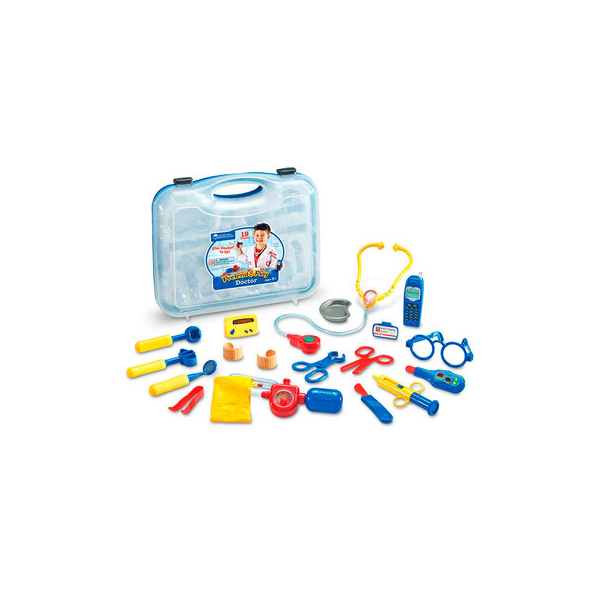Maleta de doctor color celeste. Set de instrumentos representativos de uso de un doctor. Piezas plasticas, resistentes que cuenta con las siguientes piezas: un estetoscopio con pilas, un telefono celular con sonido, Pinzas, 2 vendajes, anteojos, etiquetas, bisturi, Termometro, Pinzas, Jeringa, Esfigmomanometro, Tijeras, Martillo de reflejos, Bedpan, alcance del oido, Espejo dental. Maletin mide 36cm x 31cm.