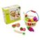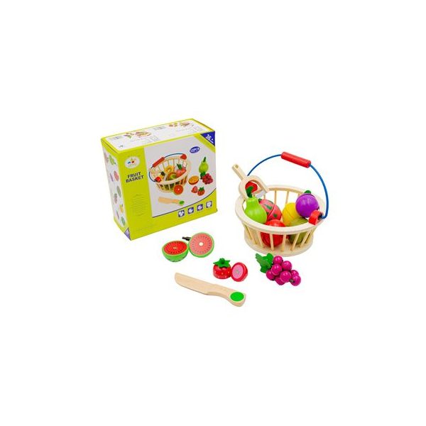 Canasto de madera con asa de metal, con medidas 17,5 x 9 cm. Incluye 11 piezas, 9 frutas de madera con iman con medidas entre 5,5 x 4 y 6,5 x 5 cm, 1 cuchillo de madera con puntas redondeadas, con medidas 14 x 3 cm y 1 cortador de madera con medidas 8,5 x 6 cm. Presentacion caja de carton 20 x 18 x 9,5 cm.