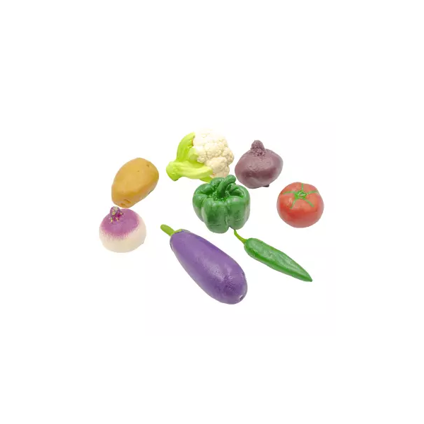 Set de 8 verduras tamano real. Set contiene coliflor, papa, rabano, aji, tomate, pimenton, berenjena y betarraga. Todos en tamano real fabricados en goma blanda texturado segun el vegetal. Presentacion en malla plastica.