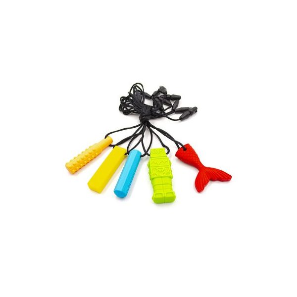 Set de 5 mordedores sensoriales de diferentes formas, texturas y colores, fabricados en silicona resistente no toxica. Medidas aproximada de cada mordedor 7 x 1,5 x 2,5 cm. aprox. Todos los mordedores tienen un cordon de tela para colgar. Presentacion en bolsa transparente.