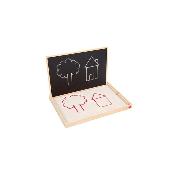 Bandeja multisensorial para desarrollar la pre-escritura y la coordinacion ojo-mano, mediante la representacion creativa de figuras a traves del tacto. Inspirado en la metodologia Montessori. Incluye: bandeja de madera con medidas58.9 x 40.2 cm, una pizarra reversible: para tiza y para rotulador borrable, tres tizas, un borrador, un rotulador, 3 paquetes de arena de 0,4 kg. y un alisador de arena.