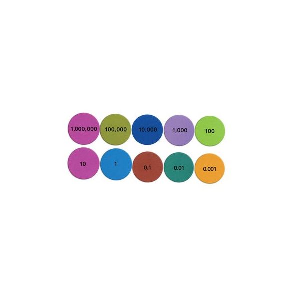 Set de 200 fichas magneticas para demostrar el valor posicionar, material goma EVA, tamano 5 cm, de diferentes colores como rosado, verde oscuro, azul, celeste, morado, verde claro, rojo, naranjo. Material educativo para el desarrollo de actividades matematicas tales como: contar, clasificar y secuenciar.
