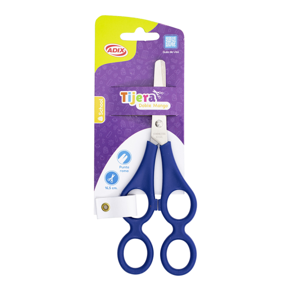 La tijera doble mango está diseñada especialmente para guiar a los niños en sus primeros cortes. Su sistema de doble mango permite que un adulto y un niño la sostengan al mismo tiempo, haciendo el aprendizaje más seguro y divertido.