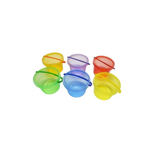 Maximize Set de 6 baldes traslucidos 6 colores, material plastico resistente con medidas 13 x 16 cm. Desarrolla motricidad, creatividad, imaginacion, trabajo en equipo y fortalece el juego de roles.