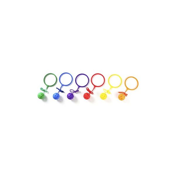 Set de 6 aros de tobillo con pelota para coordinacion, diferentes colores, material plastico resistente, con medidas 74 cm la cuerda, 14 cm el aro y 7 cm la pelota. Este juego motriz permite el desarrollo de actividades fisicas de coordinacion y equilibrio en forma segura a traves del juego. Los colores son: azul, rojo, verde, amarillo, anaranjado y violeta.