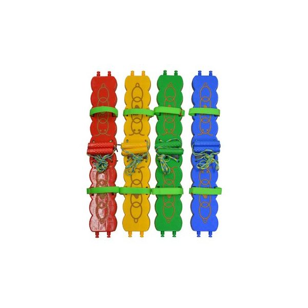 Set de 4 pares de zancos colectivos de colores rojo, verde, amarillo y azul, con medidas 38 x 12 x 2,5 cms cada pieza. Los zancos son un juego entretenido para fortalecer la habilidad y el equilibrio en los ninos y ninas. Material plastico resistente, con goma antideslizante. Presentacion en caja de carton medidas 42 x 21 x 17 cm.