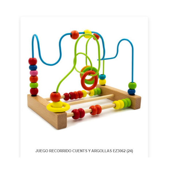 Juego de recorrido motriz con cuentas y argollas de madera y metal reforzado en llamativos colores de 23 x 16 x 15 cms. Incluye 32 cuentas y 4 argollas. Desarrolla Psicomotricidad fina, percepcion de forma y color, atencion, coordinacion visomanual estimulando habilidades cognitivas. Presentacion caja de carton medidas 23 x 18,5 x 16 cm.