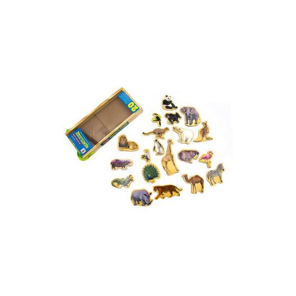 Set compuesto por 20 figuras de animales magneticas de madera termolaminada, medidas entre 13 y 5 cm. Incluye animales como jirafa, cebra, leopardo, hipopotamo, panda, entre otros. Fortalece la creatividad en los ninos asi como tambien la clasificacion, seriacion, motricidad y atencion. Presentacion caja de madera con tapa removible de plastico, medidas 27,5 x 12 x 3 cm.