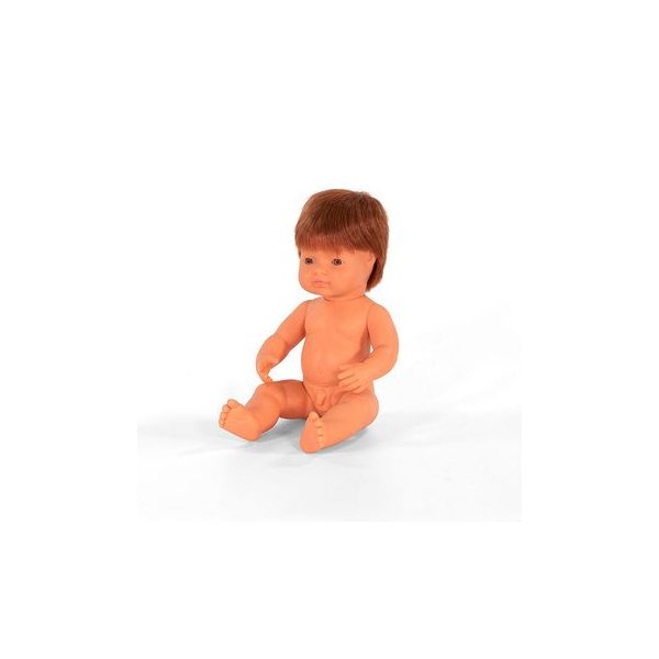 Muneco con caracteristicas representativas de la raza caucasica pelo pelirrojo y ojos cafe. Articulado y con anatomia correcta. Medidas 38 cm. Material vinilo extra suave reciclable, con un ligero aroma a vainilla. Material disenado para promover valores de igualdad entre los ninos y ninas, sea cual sea su raza, genero o condicion y les permite sensibilizarse con la diversidad, asi como desarrollar habilidades sociales como la empatia y la tolerancia. Presentacion bolsa plastica transparente.