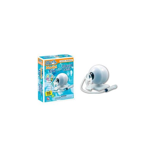 Set compuesto por 20 piezas armables de material plastico de diferentes tamanos y formas, armado mide 11 x 11 x 12 cm. Este material esta disenado para aprender como opera el ojo humano, reproduciendo su funcionamiento interno, solo debes llenar el lente de liquido y el modelo enfocara la luz ajustandose de concavo a convexo. Presentacion caja de carton medidas 17 x 6 x 23 cm