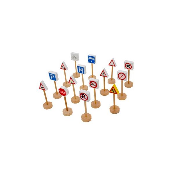 Set de 15 signos de transito de madera con medidas 12 cm de alto. Fortalece habitos de comportamiento civico, practicar actitudes de precaucion y respeto, reconocimiento y la interpretacion clara de las senales de transito. Presentacion en caja de carton 21 x 15 x 5 cm.