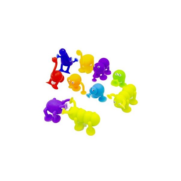 Set de 10 animales monstruitos con ventosas, diferentes tamanos, formas y colores. Fabricados en goma suave. Medidas aprox. 3,5 x 5,5 x 6,5 cm. Presentacion en bolsa de plastico transparente.