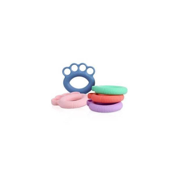 Set de 5 empunaduras de relajacion Cada pieza esta fabricada en silicona resistente y suave, no toxica, con medidas 10 x 2 x10 cm. Presentacion en bolsa de plastico transparente.