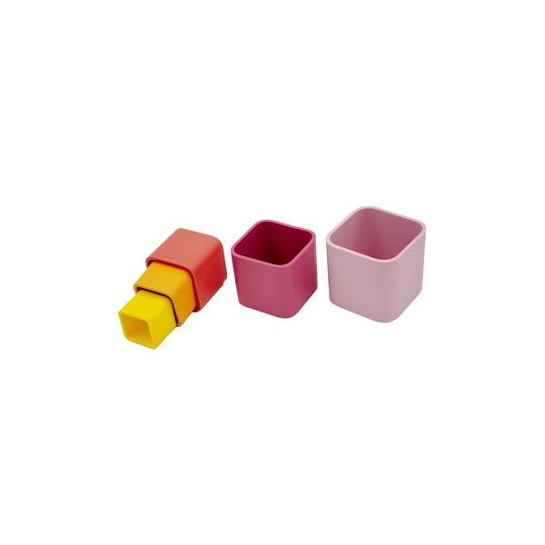 Set de 7 cubos apilables, en distintos tamanos. Fabricados en goma flexible y suave. Medidas desde 7,5 x7,5 cm. hasta 3 x 3 cm. Presentacion en caja de carton con ventana medidas 8 x 8 cm.