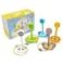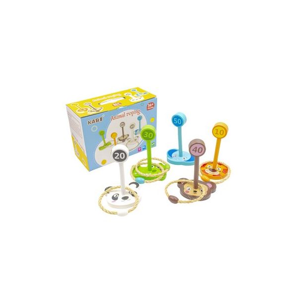 4 soportes para lanzamiento. Fabricados en madera pintada altura 18 cm. con base con forma de animales de 13 x 9 x 1,5 cm. 5 anillos fabricados en cuerda de canamo, con diametro 11 cm. Presentacion en caja de carton medidas 30,5 x 22 x 13,5 cm.