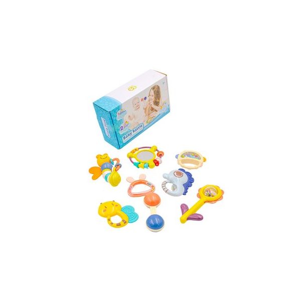 Set de 8 sonajeros mordedores. Set contiene 8 distintos modelos y tipos de sonajeros. Fabricados en goma y plástico duro no tóxico. Medidas van entre 15 y 4 cm. Presentación caja de cartón duro. medidas 23 x 7 x 14 cm.lavables.