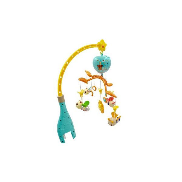 Movil con sonidos y control. Set contiene un soporte dividido en dos que con fijador. Medidas 60cm de altura. 5 elementos colgantes con sonidos de sonajeros con medidas de 9 x 4 x 4 cm. aprox. Con motor que entrega sonidos y movimiento medidas 10 x 7,5 x 10 cm. aprox., funciona con 3 pilas AA no incluidas. Un control remoto medidas 8,5 x 4 cm. y un soporte con 4 lados para los elementos colgantes, medidas 31 x 31 cm. Presentacion en caja de carton con mango de plastico, medidas 41 x 29 x 8 cm.