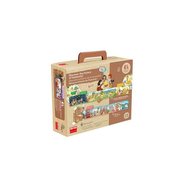 Juego de asociacion, Historia de la Humanidad. Contiene 30 piezas cuadradas de 9 x 9 cm. , una linea de tiempo encajable de 5 piezas y 5 pentagonos de 18 x 15,5 cm. Todos fabricadas en carton duro con ilustraciones. Presentacion en caja de carton con mango medidas 24,5 x 7 x 13,5 cm.