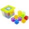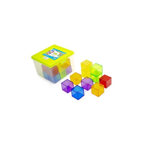 Set de 18 cubos fabricado en plástico de colores transparente. Medidas 4 cm. por lado. Presentación en caja de plástico con tapa 15,5 x 11 x 15,5 cm.