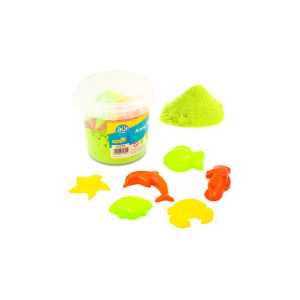 Pote de arena mágica de 500gr. Color verde de suave textura. Estimula la creatividad y las habilidades motoras. Presentación pote plástico con tapa. Incluye 6 moldes.